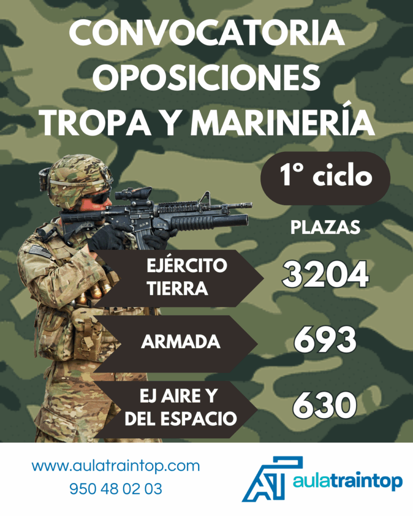 Aula Traintop es la academia para prepararte para opositar a tropa y marinería en Almería, que estabas buscando. Con más de 20 años de experiencia, en el sector de las oposiciones y la formación, te acompañamos en tu preparación para conseguir tu plaza en el ejército en unos meses.