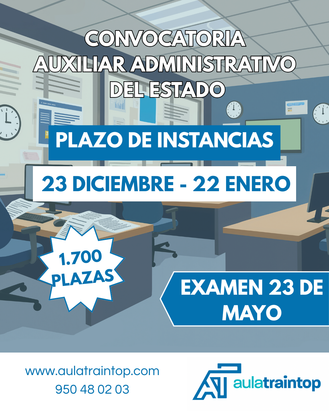 Si estás pensando en dar un cambio de vida y te gustaría trabajar como auxiliar administrativo del Estado, Aula Traintop es la academia de oposiciones para auxiliar administrativo que buscabas, donde obtendrás toda la información y el material que necesitas para prepararte y, sobre todo, superarlas con éxito. Nuestros cursos intensivos y especializados, según el área que necesites mejorar, están a tu disposición en nuestra web.